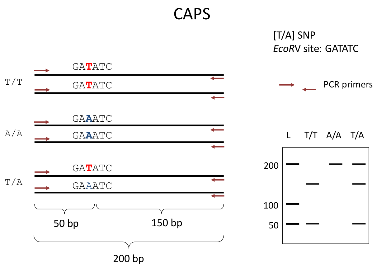 class: center, middle, inverse, title-slide # Molecular Marker Development ## A simple introduction and computer demo ### Junli Zhang ### 2017/11/11 --- background-image: url(https://upload.wikimedia.org/wikipedia/commons/9/96/Polymerase_chain_reaction.svg) ??? Image credit: [Wikimedia Commons](https://commons.wikimedia.org/wiki/File%3APolymerase_chain_reaction.svg) --- # Molecular Markers ## Wikipedia's defination In genetics, a **molecular marker** (identified as genetic marker) is a fragment of DNA that is associated with a certain location within the genome. ## Reflect Polymorphism in a Population --- # Steps of marker Development 1. Find DNA sequence variaitons within a population or between two parents 1. Need a way to screen the variations in a populations: chips, sequencing or PCR ## Here I will just focus on PCR method, that is, we need to .red[design primers]! --- # DNA sequence mutations ### A mutation is a change in the "normal" base pair sequences - #### a single base pair substitution .remark-code[ CGAGCTTGA**T**GACGAAGAAGGAG</br> CGAGCTTGAGACGAAGAAGGAG ] -- - #### a small deletion or insertion .remark-code[ CGAGCTTGA**TGA**CGAAGAAGGAG</br> CGAGCTTGACGAAGAAGGAG ] -- - #### a larger insertion or deletion or rearrangement - inversion, duplications, translocations etc ??? Credit: Youtube lecture [DNA Sequence Variation](https://youtu.be/ZXQuQJjdPvk) --- ## Types of molecular markers - RFLP: Restriction Fragment Length Polymorphism - RAPD: Random Amplified Polymorphic DNA - AFLP: Amplified Fragment Length Polymorphism - SSR: Simple Sequence Repeats - or microsatellite - ~1-5 bp core unit - SNP: Single Nucleotide Polymorphism ### A very good review on genetic markers and QTL mapping .cite[Collard, B.C.Y., Jahufer, M.Z.Z., Brouwer, J.B. et al. Euphytica (2005) 142: 169. https://doi.org/10.1007/s10681-005-1681-5] --- class: middle, center # Dorminant vs. Co-dorminant markers  --- # Common PCR-based genotyping methods for SNP markers - CAPS: - Cleaved Amplified Polymorphic Sequences - A Single Nucleotide Polymorphism (SNP) where one allele creates (or removes) a naturally occurring restriction site - Codorminant -- - dCAPS: - Derived Cleaved Amplified Polymorphic Sequences - For SNPs that do not create a natural restriction site. - Uses mismatches in one PCR primer to create or remove a restriction site for one allele - Codorminant -- - KASP: - Kompetitive Allele Specific PCR - A homogenous, fluorescence-based genotyping variant of PCR. - Based on allele-specific oligo extension and fluorescence resonance energy transfer for signal generation - Codorminant ---  --- background-image: url(https://www.ncbi.nlm.nih.gov/core/assets/probe/images/dCAPS_example.png) --- # Genotyping - dCAPS - Derived CAPS uses a mismatched PCR primer to create or remove a restriction site based on the genotype of a SNP. -- - Advantages: - Can be used when the SNP does not create a natural CAPS/RFLP marker. - Can be used to change a natural CAPS marker from a site using an expensive or rare enzyme to a cheap or common enzyme. -- - Disadvantages: - Mismatches in primer lowers PCR specificity. - Laborious compared to hybridization with gene chip methods for SNP detection. - Finding the right enzyme. Can use web site: http://helix.wustl.edu/dcaps/dcaps.html to find dCAPS primers for SNPs. ??? Credits: [dCAP genotyping slides](https://www.google.com/url?sa=t&rct=j&q=&esrc=s&source=web&cd=10&ved=0ahUKEwj3y86F-bHXAhVEllQKHQMpBF8QFghPMAk&url=http%3A%2F%2Fwww.genetics-gsa.org%2Feducation%2Fpdf%2FHultman%2520and%2520Mellgren%25202014%2520Fetching%2520SNPs%2520Supplemental%25202%2520-%2520dCAPS%2520genotyping%2520slides.pptx&usg=AOvVaw2Hb0zyAzAfqRomIx4MkizO) --- # dCAPS **IWB1998**: CGAGCTTGATGACGAAGAAGGAGA[**T/C**]CGGGCAGACCCACGACGT **EcoRV**: GAT'ATC Allele | Seq --- | --- C | CGAGCTTGATGACGAAGAAGGGGCAGACCCACGACGT T | CGAGCTTGATGACGAAGAAGGGGCAGACCCACGACGT Primer | CGAGCTTGATGACGAAGAAGGAA -- **After PCR** Allele | Seq --- | --- C | CGAGCTTGATGACGAAGAAGGGGCAGACCCACGACGT T | CGAGCTTGATGACGAAGAAGGGGCAGACCCACGACGT --- # dCAPS example: IWB1998 .pull-left[ #### Steps 1. PCR with dCAPs primers 1. Digest products with EcoRV 1. Run on gel #### Expected results for three genotypes: – Homozygous C/C –181 bp – Homozygous T/T –157, 24 bp – Heterozygous C/T –181, 157, 24 bp ] .pull-right[  ] ??? The 20 bpproduct will run off gel, since we run gel long enough to resolve between 163 and 143 bp --- # CAPS gel scoring  --- # KASP components  ---  --- class: center  --- name: inverse class: center, middle, inverse ## That is all the introductions. ## ![:emoji smiley] Let us develop markers ![:emoji smiley] --- # Steps in primer design .wide-left[ 1. Find the locations on wheat pseudomolecule of the flanking markers - Blast the sequences of your markers against the wheat pseudomolecule 1. Find all the variations between the two parents of your population in the region between two flanking markers - You already have the exon capture data for both parents on [T3](https://triticeaetoolbox.org/wheat/display_genotype.php?trial_code=2017_WheatCAP) - Extract variations only in the target regions 1. Design primers for a certain variations to screen recombinants - Majority will be SNPs, small insertions or deletion. - We fill focus on CAPS/dCAPS/KASP ] .narrow-right[  ] --- class: graylist # Requirements of PCR primers - ## Specific -- - Length: 18 - 25 -- - Melting Temperature: around 60 °C -- - GC Clamp: G or C bases within the last five bases in the 3' end helps promote specific binding, but more than 3 G/C should be avoided -- - NO Secondary Structures -- - Avoid Template Secondary Structure or other complex regions, such as retros -- - Amplicon Length: qPCR and dCAPS are short (< 300 bp), other markers usually < 1 kb -- - Primer Pair Tm Difference < 5 C [More information](http://www.premierbiosoft.com/tech_notes/PCR_Primer_Design.html) --- class: graylist # Primer Design Tips - The first nb in the 3' end is most important; avo